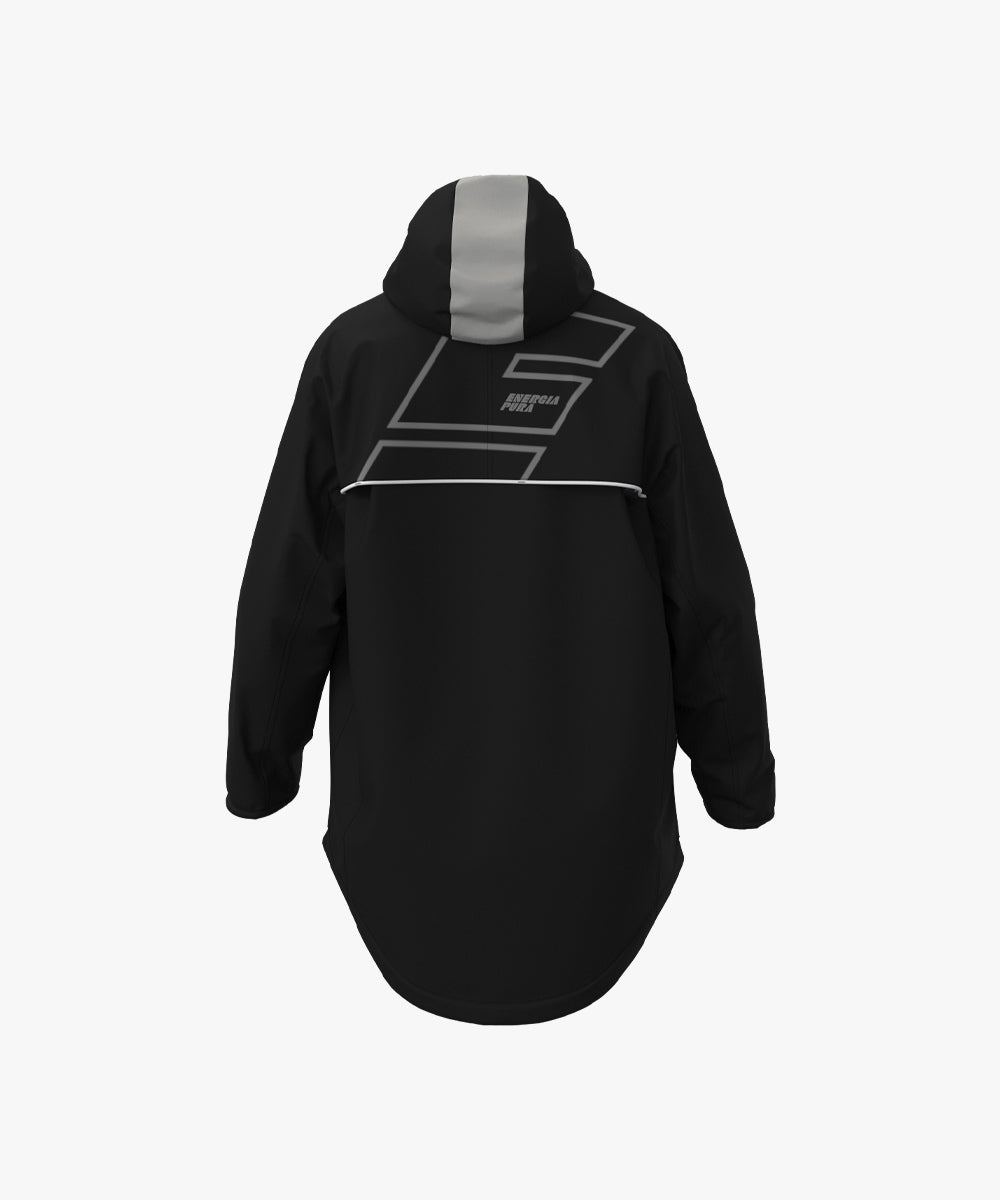 Tejido trilaminado con parte exterior de poliamida de alta tecnicidad, 100% impermeable y oleófuga, con membrana. Membrana monoelástica de poliuretano, impermeable, suave, ligera y resistente. Columna de agua de 20.000 mm en 24 horas, transpiración de 10.000 g/m² en 24 horas. El tejido está tratado para permitir que los líquidos se deslicen con gran rapidez, por lo que no absorbe nieve, agua ni suciedad. El tejido permanece inalterado y conserva sus características incluso después de numerosos lavados. Prenda impermeable y transpirable con costuras termoselladas. Espalda y pecho con sistema de ventilación. Las dimensiones de esta prenda están diseñadas para facilitar su uso a los atletas que entrenan incluso en condiciones climáticas extremas, como nieve intensa, lluvia o viento fuerte.