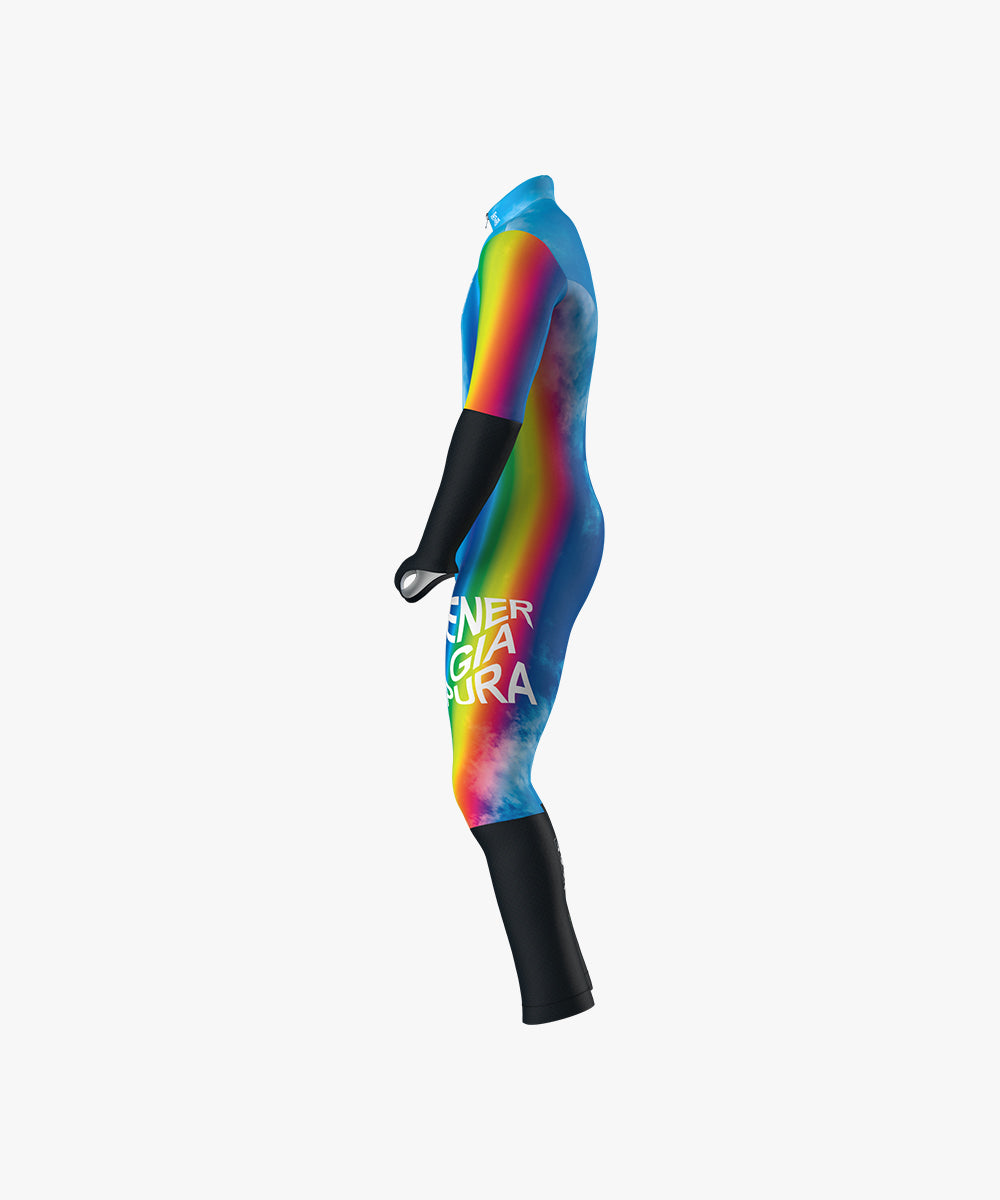 Traje de competición con tejido bielástico, transpirable, cortavientos y antidescamación. El modelo se ha diseñado pensando en las posturas del atleta durante la carrera, garantizando un excelente agarre al cuerpo y una alta elasticidad para ofrecer la máxima libertad de movimiento en cualquier posición. Un cierre frontal facilita la entrada del cuerpo y una banda de goma antideslizante en la parte inferior de la pierna permite un mejor agarre a la bota. El traje incluye un bolsillo para el pase.